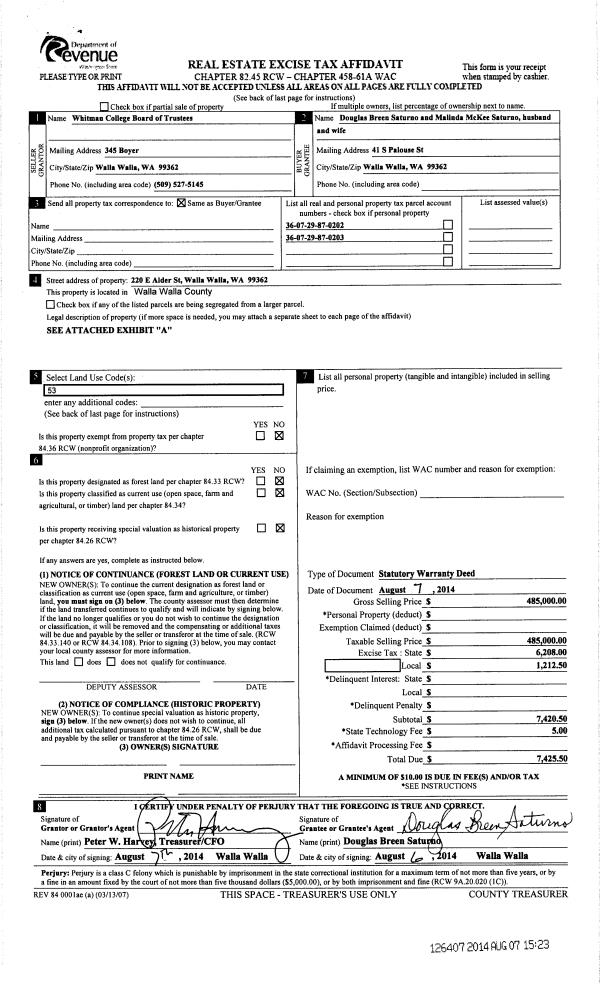 | 2 | 08/07/2014 | SWD | STATUTORY WARRANTY DEED | WHITMAN COLL BOARD OF TRUSTEES | SATURNO DOUGLAS BREEN | | 2-PARCELS | $485,000.00 | 126407 | 2014-05638 |