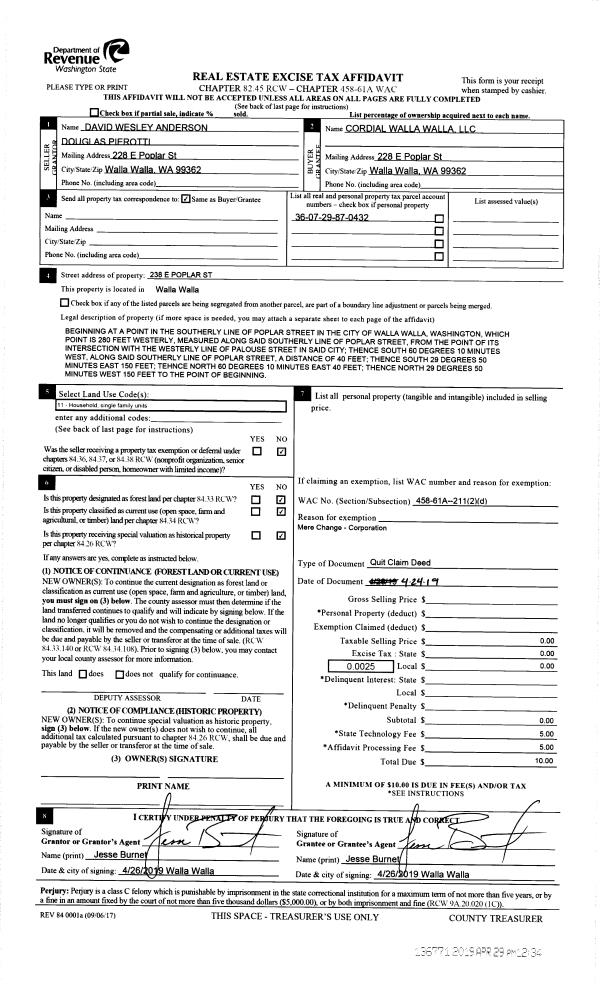 | 2 | 04/24/2019 | QCD | QUIT CLAIM DEED | ANDERSON DAVID WESLEY | CORDIAL WALLA WALLA LLC | | | $0.00 | 136771 | 2019-02752 |