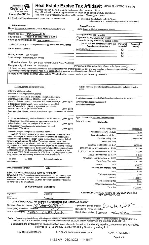 | 1 | 05/24/2021 | SWD | STATUTORY WARRANTY DEED | MARTINEZ FRANCISCO JOSE & CIERRA PAIGE | HADLEY RENEE M | | | $300,000.00 | 141617 | 2021-06235 |