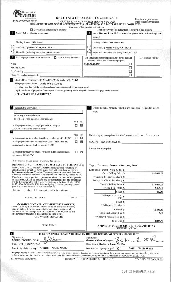 | 1 | 04/05/2018 | SWD | STATUTORY WARRANTY DEED | OLSON ROBERT J | MCRAE BARBARA I | | | $185,000.00 | 134452 | 2018-02630 |