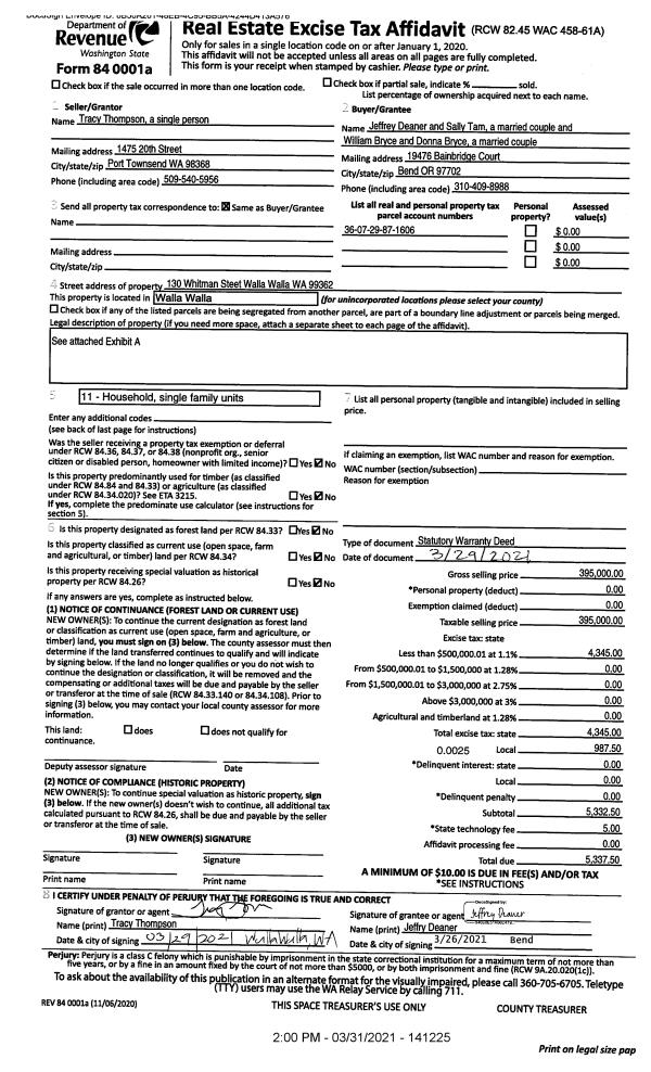 | 2 | 03/31/2021 | SWD | STATUTORY WARRANTY DEED | THOMPSON TRACY | DEANER JEFFREY & SALLY TAM | | | $395,000.00 | 141225 | 2021-03741 |