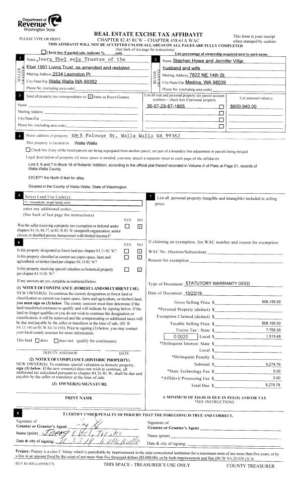 | 3 | 10/25/2019 | SWD | STATUTORY WARRANTY DEED | EBEL 1991 LIVING TRUST | HOWE STEPHEN & JENNIFER VILLAR | | | $606,195.00 | 137955 | 2019-08646 |