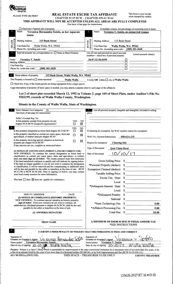 | 1 | 10/10/2017 | QCD | QUIT CLAIM DEED | SOTELO VERONICA HERNANDEZ | SOTELO VERONICA V | | | $0.00 | 133426 | 2017-08184 |