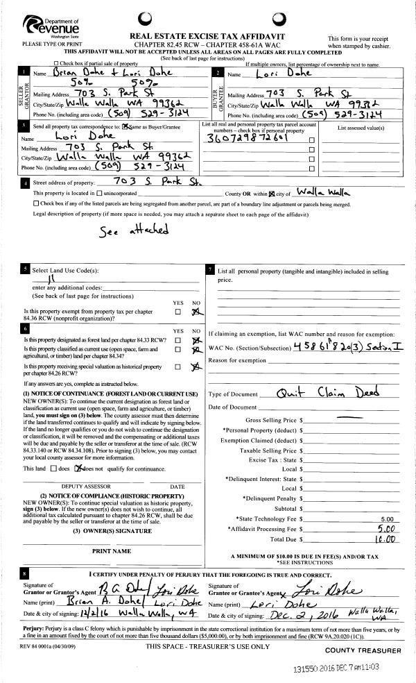 | 2 | 12/02/2016 | QCD | QUIT CLAIM DEED | DOHE BRIAN A & LORI J | DOHE LORI | | | $0.00 | 131550 | 2016-10027 |
