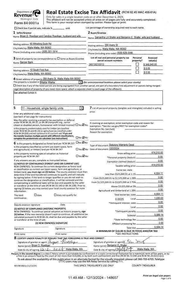 | 1 | 12/13/2024 | SWD | STATUTORY WARRANTY DEED | ROEDIGER BRYAN D & CANDICE | SHAFER SAMANTHA LH & BENJAMIN E | | | $414,010.00 | 148657 | 2024-07203 |