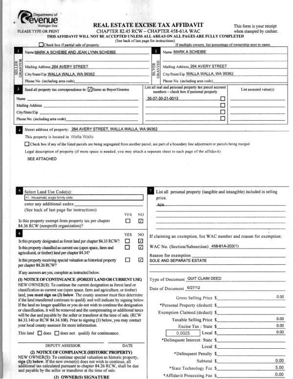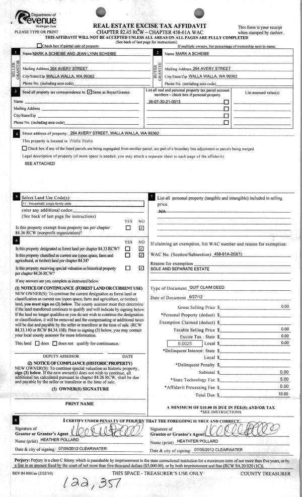 | 3 | 07/17/2012 | QCD | QUIT CLAIM DEED | SCHEIBE, MARK A & JEAN LYNN | SCHEIBE, MARK A | | | $0.00 | 122351 | 2012-06031 |