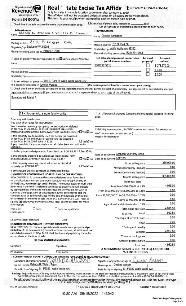 | 1 | 05/16/2022 | SWD | STATUTORY WARRANTY DEED | BRONSON WILLIAM E & SHARON J | SPRINGBETT CHEYNE | | | $365,000.00 | 143942 | 2022-04115 |