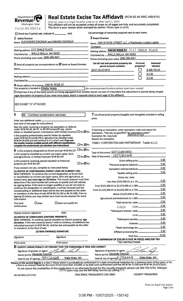 | 1 | 10/07/2025 | QCD | QUIT CLAIM DEED | EWONIUK ALEXANDER & AMANDA | 1445 W ROSE STREET LLC | | | | 150142 | 2025-06140 |