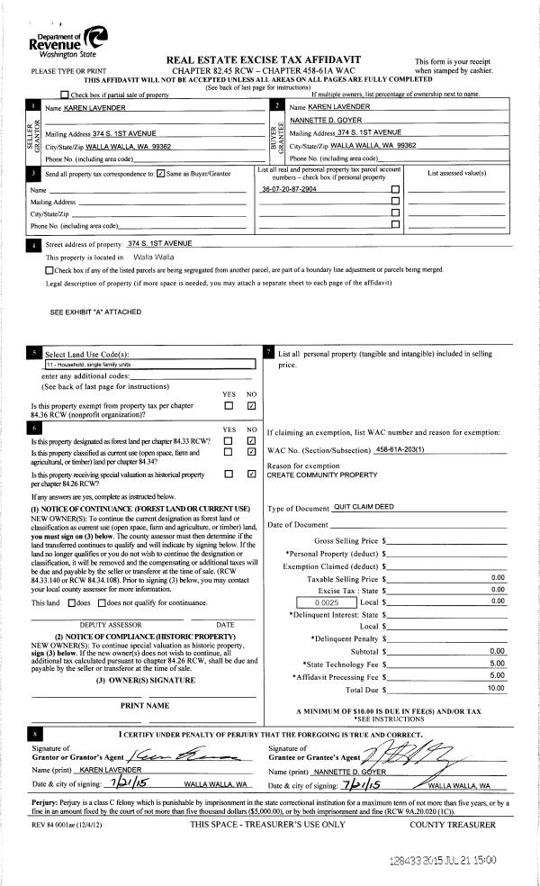 | 3 | 07/21/2015 | QCD | QUIT CLAIM DEED | LAVENDER KAREN | LAVENDER KAREN | | | $0.00 | 128433 | 2015-06209 |