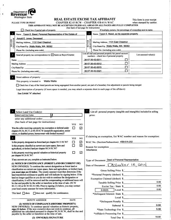 | 2 | 12/19/2014 | DPR | DEED OF PERSONAL REPRESENTATIVE | JONES ARNOLD E ESTATE OF | BASEL TYSON E | | 4-PARCELS | | 127147 | 2014-09252 |
