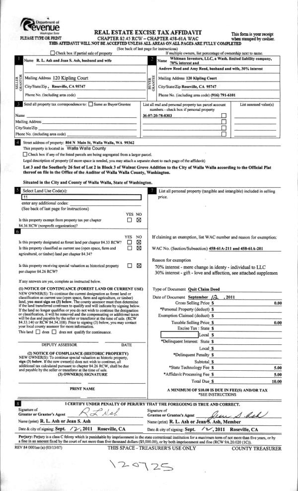 | 5 | 09/22/2011 | QCD | QUIT CLAIM DEED | ASH, R L & JEAN | WHITMAN INVESTORS LLC | | | | 120725 | 2011-07376 |