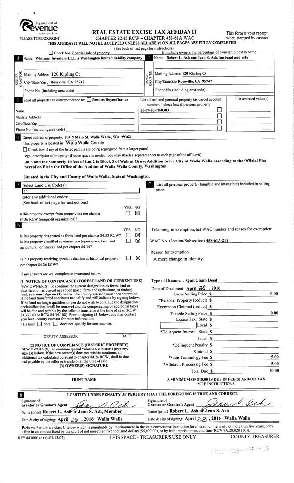 | 9 | 07/22/2004 | QCD | QUIT CLAIM DEED | ASH, R L & JEAN S | WHITMAN INVESTORS LLC | | | | 105301 | 2004-08268 |