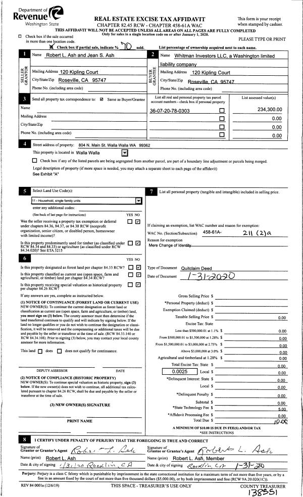 | 3 | 01/31/2020 | QCD | QUIT CLAIM DEED | ASH ROBERT L & JEAN S | WHITMAN INVESTORS LLC 70% | | | $0.00 | 138551 | 2020-01040 |