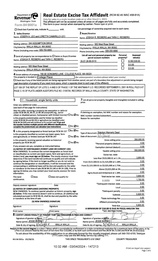 | 1 | 03/04/2024 | SWD | STATUTORY WARRANTY DEED | LEO JOSEPH A | REDBERG JOSHUA R & TARA C | | | $350,000.00 | 147213 | 2024-01066 |
