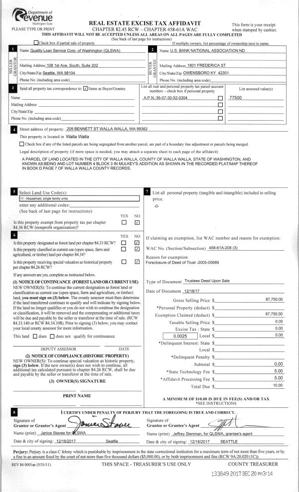 | 2 | 12/20/2017 | TRUSTEES D | TRUSTEE'S DEED | SENNETT DENNIS & THERESA A | US BANK NATIONAL ASSOCIATION | | | $87,750.00 | 133849 | 2017-10247 |