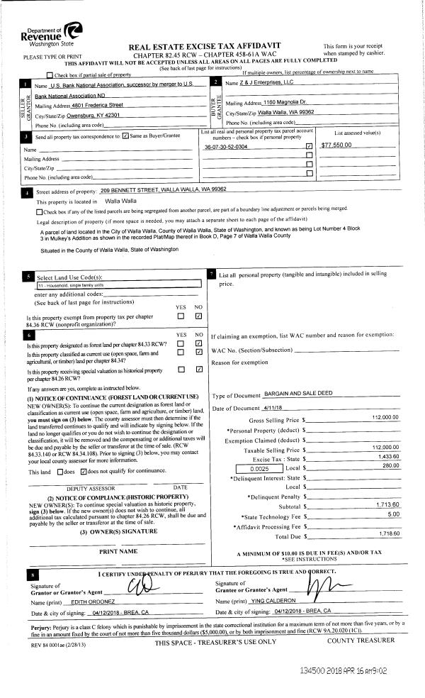 | 1 | 04/16/2018 | BARGAIN & | BARGAIN & SALE DEED | US BANK NATIONAL ASSOCIATION | Z & J ENTERPRISES LLC | | | $112,000.00 | 134500 | 2018-02890 |