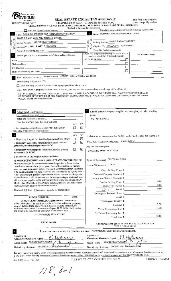 | 2 | 08/05/2010 | QCD | QUIT CLAIM DEED | SWOPES, ROLAND L | SWOPES, ROLAND L | | | | 118827 | 2010-06055 |