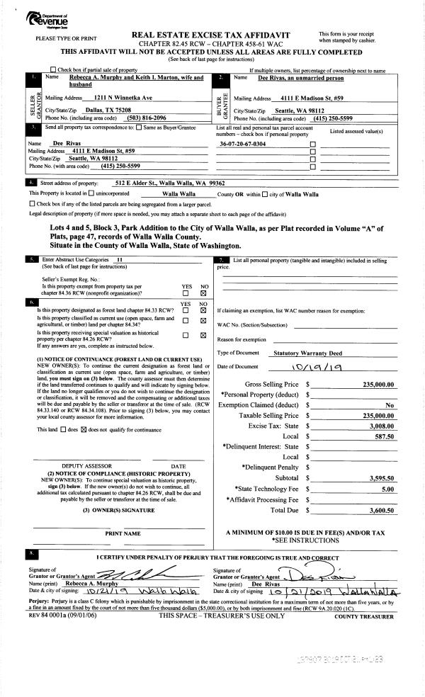 | 2 | 10/21/2019 | SWD | STATUTORY WARRANTY DEED | MARTON KEITH I | RIVAS DEE | | | $235,000.00 | 137907 | 2019-08434 |