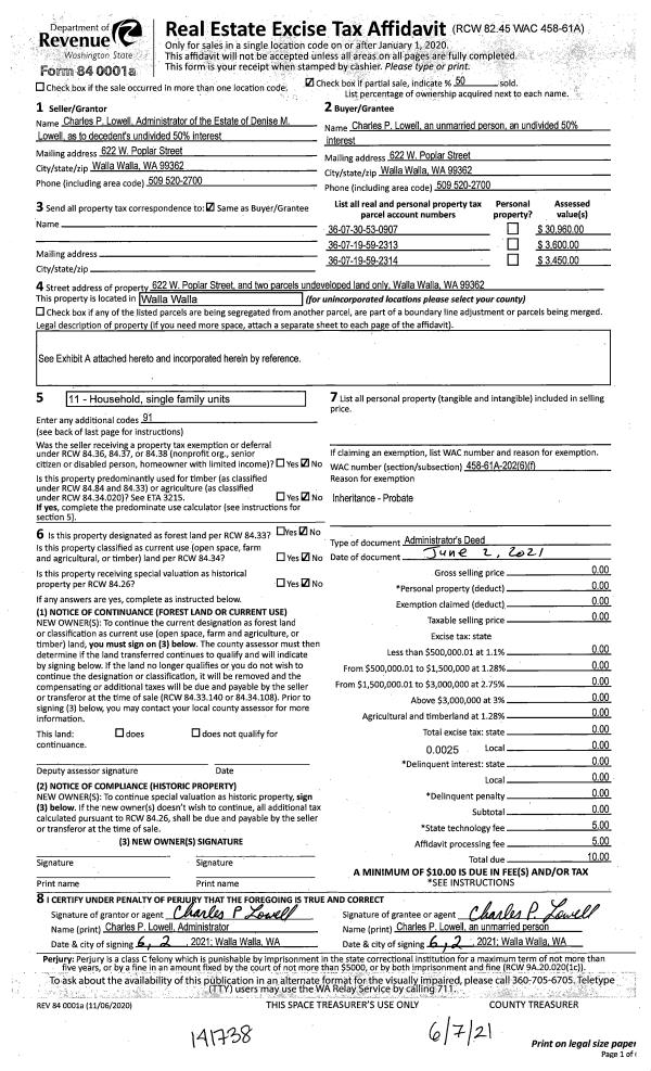 | 1 | 06/02/2021 | ADMD | ADMINISTRATOR'S DEED | LOWELL CHARLES P & DENISE M | LOWELL CHARLES P | | 3 PARCELS | $0.00 | 141738 | 2021-06873 |