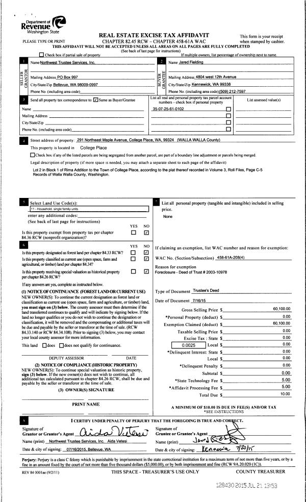 | 1 | 07/21/2015 | TRUSTEES D | TRUSTEE'S DEED | NORTHWEST TRUSTEE SERVICES INC | FIELDING JARED | | | $60,100.00 | 128430 | 2015-06197 |