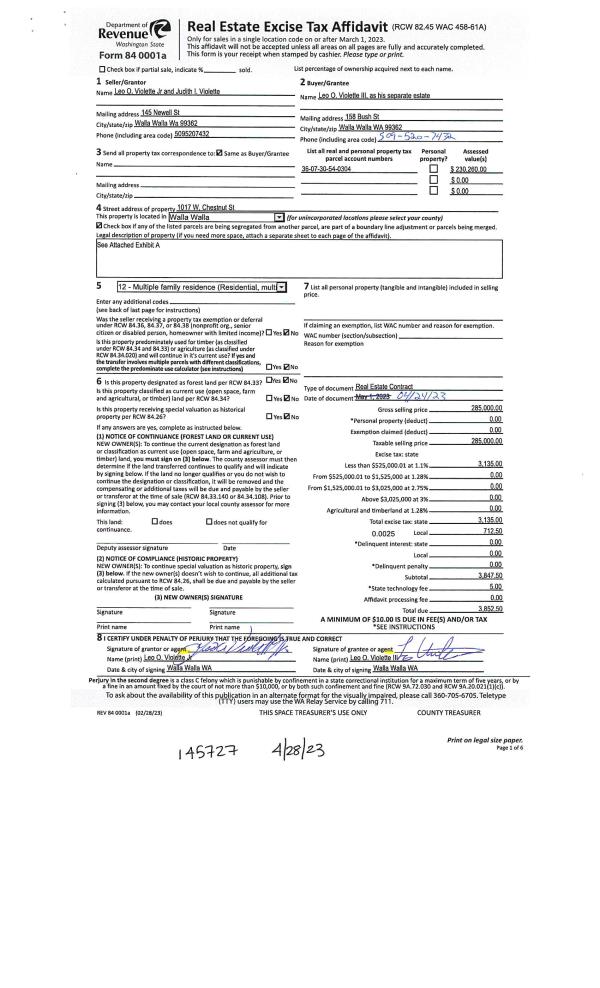 | 1 | 04/28/2023 | REAL ESTAT | REAL ESTATE CONTRACT | VIOLETTE LEO O JR & JUDITH J | VIOLETTE LEO O III | | | $285,000.00 | 145727 | 2023-02235 |