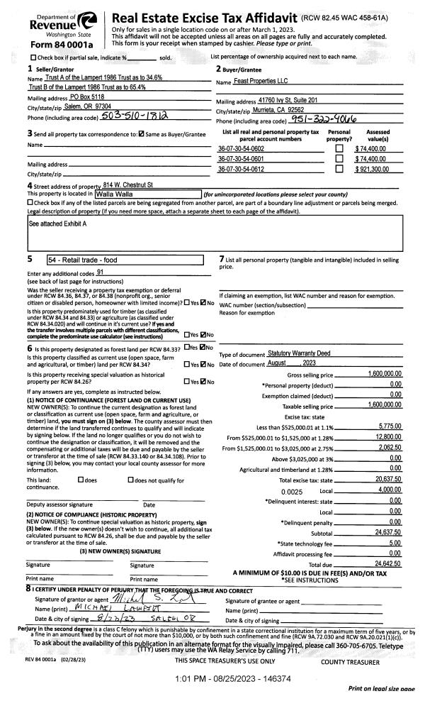 | 1 | 08/23/2023 | SWD | STATUTORY WARRANTY DEED | TRUST A OF THE LAMPERT 1986 TRUST | FEAST PROPERTIES LLC | | 3-PARCELS | $1,600,000.00 | 146374 | 2023-04942 |