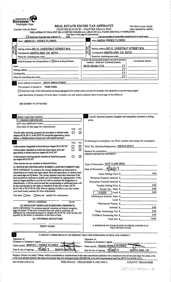 | 1 | 04/26/2017 | QCD | QUIT CLAIM DEED | FLORES MARCO I PEREZ | FLORES NADIA PEREZ | | | | 132270 | 2017-03113 |