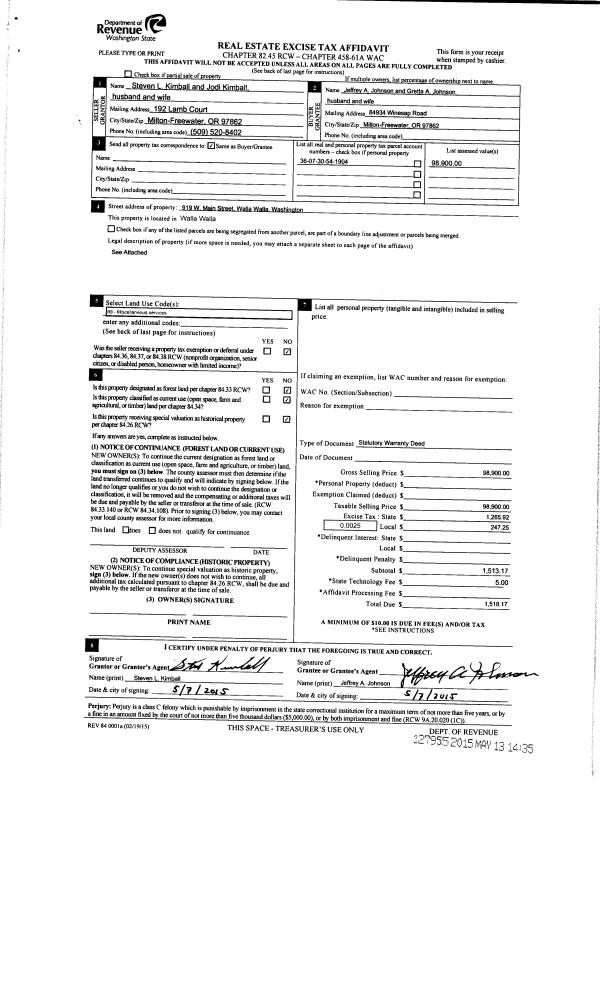 | 1 | 05/13/2015 | SWD | STATUTORY WARRANTY DEED | KIMBALL STEVEN L & JODI | JOHNSON JEFFREY A & GRETTA A | | | $98,900.00 | 127955 | 2015-04025 |