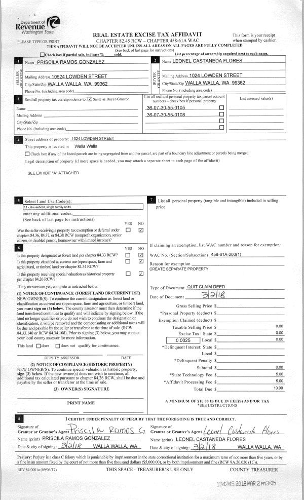 | 1 | 03/02/2018 | QCD | QUIT CLAIM DEED | GONZALEZ PRISCILA RAMOS | FLORES LEONEL CASTANEDA | | | | 134245 | 2018-01692 |