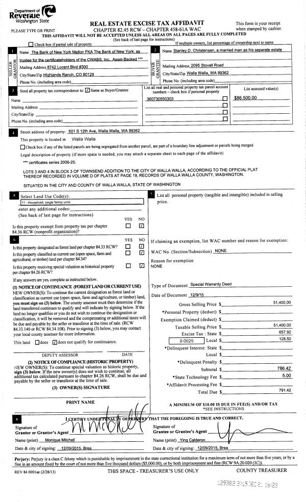 | 3 | 12/21/2015 | SWP | Special Warranty Deed | BANK OF NEW YORK MELLON | CHRISTENSEN STANLEY D | | | $51,400.00 | 129382 | 2015-10889 |
