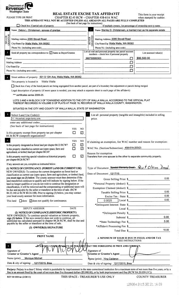 | 2 | 12/21/2015 | QCD | QUIT CLAIM DEED | CHRISTENSEN DEBRA L | CHRISTENSEN STANLEY D | | | | 129384 | 2015-10890 |