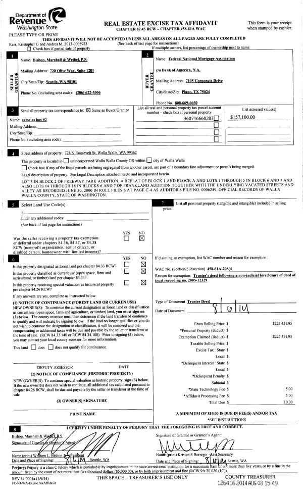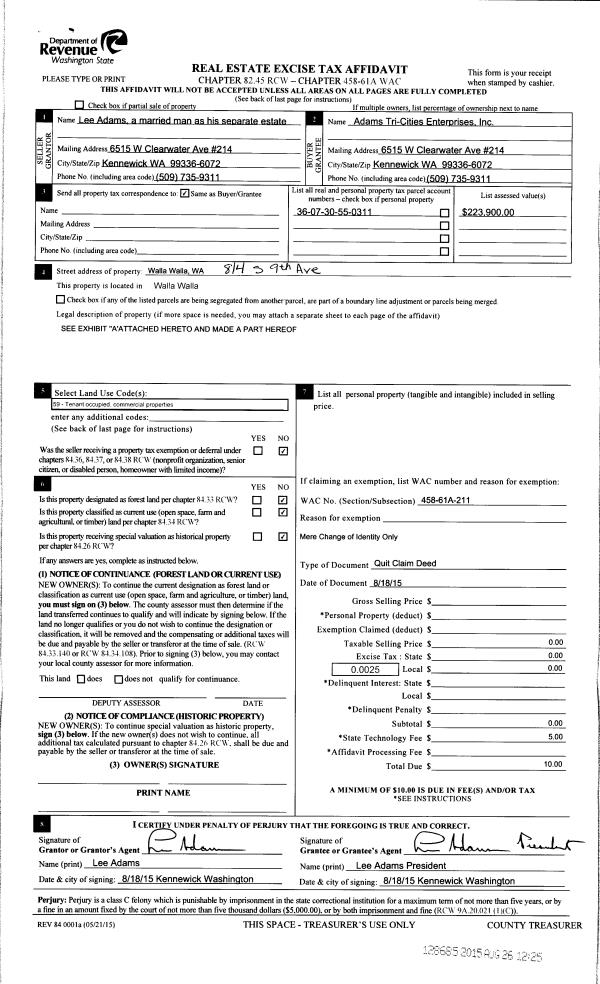 | 2 | 08/26/2015 | QCD | QUIT CLAIM DEED | ADAMS LEE | ADAMS TRI-CITIES ENTERPRISES INC | | | $0.00 | 128685 | 2015-07465 |