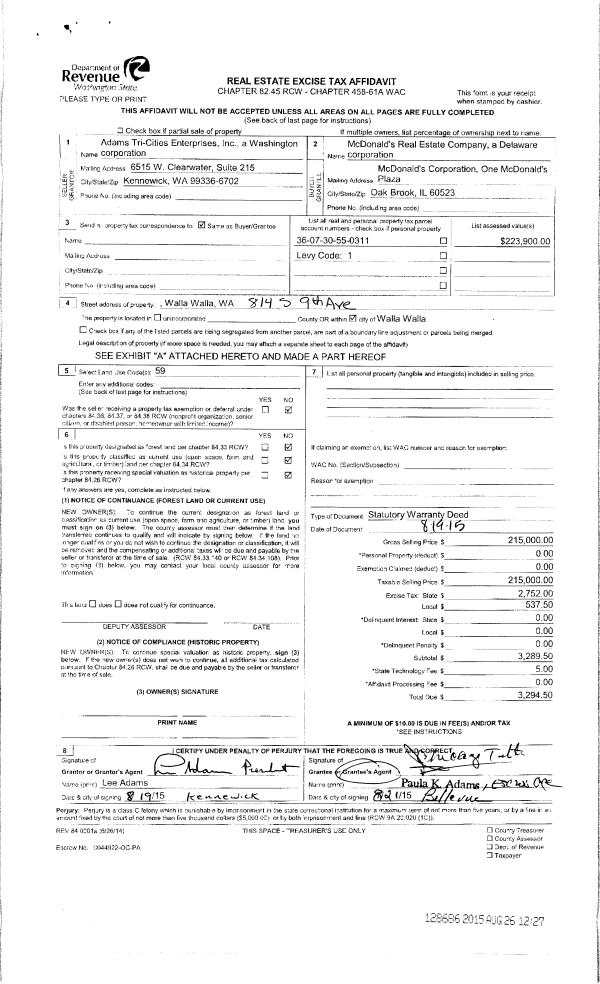 | 1 | 08/26/2015 | SWD | STATUTORY WARRANTY DEED | ADAMS TRI-CITIES ENTERPRISES INC | MC DONALDS REAL ESTATE COMPANY | | | $215,000.00 | 128686 | 2015-07466 |