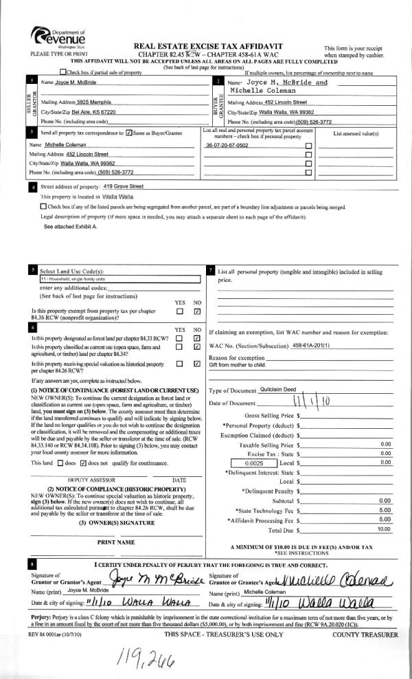 | 4 | 11/01/2010 | QCD | QUIT CLAIM DEED | MC BRIDE, JOYCE M | MC BRIDE, JOYCE M | | | | 119266 | 2010-08885 |