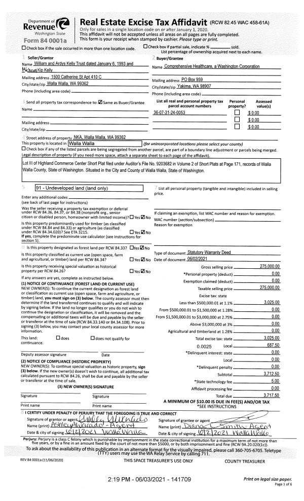 | 1 | 06/03/2021 | SWD | STATUTORY WARRANTY DEED | KELLY WILLIAM & ARDYS TRUST | COMPREHENSIVE HEALTHCARE | | | $275,000.00 | 141709 | 2021-06759 |