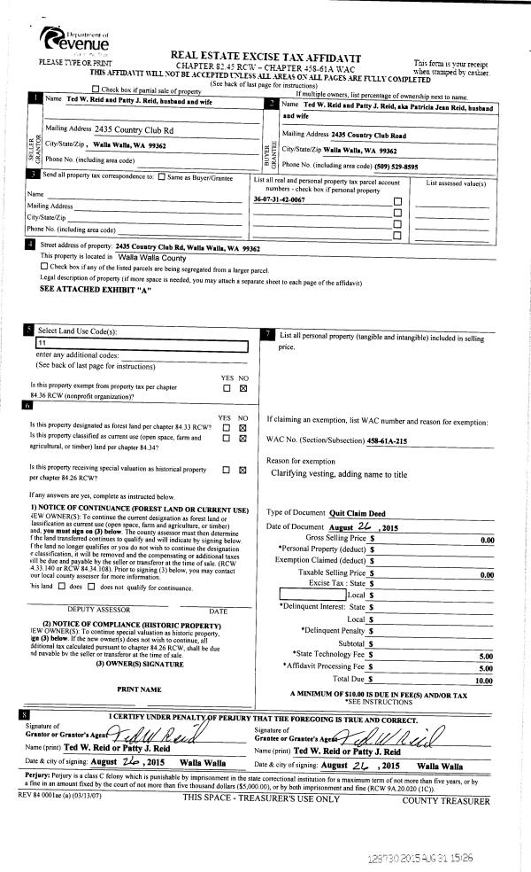 | 5 | 08/26/2015 | QCD | QUIT CLAIM DEED | REID TED W & PATRICIA J | REID TED W & PATTY J | | | $0.00 | 128730 | 2015-07636 |