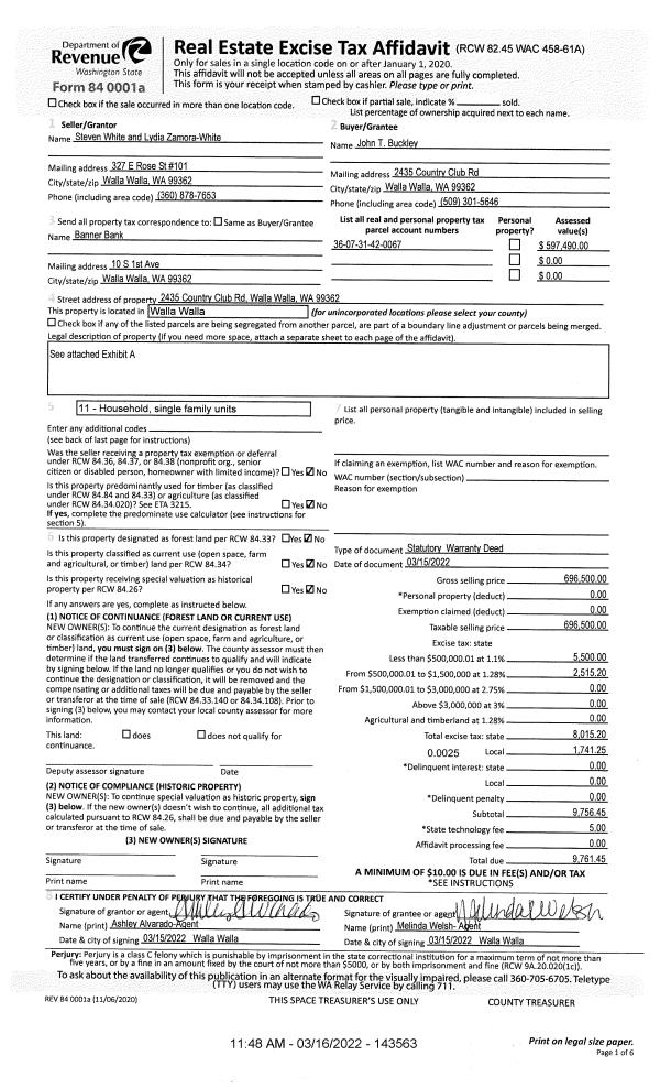 | 1 | 03/16/2022 | SWD | STATUTORY WARRANTY DEED | WHITE STEVEN & LYDIA ZAMORA-WHITE | BUCKLEY JOHN T | | | $696,500.00 | 143563 | 2022-02192 |
