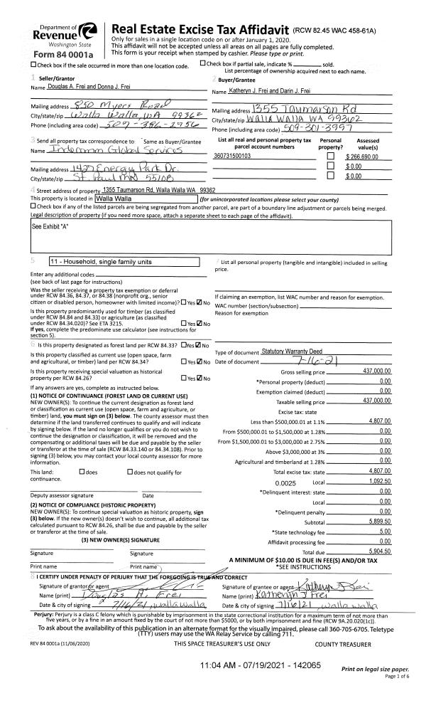 | 1 | 07/19/2021 | SWD | STATUTORY WARRANTY DEED | FREI DOUGLAS A | FREI KATHERYN J & DARIN J | | | $437,000.00 | 142065 | 2021-08721 |