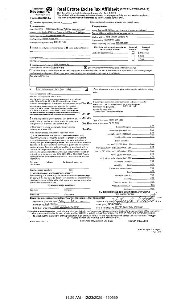 | 1 | 08/15/2014 | QCD | QUIT CLAIM DEED | WILLIAMS RAYMOND L & TOM A WILLIAMS | | | | | 126459 | 2014-05900 |