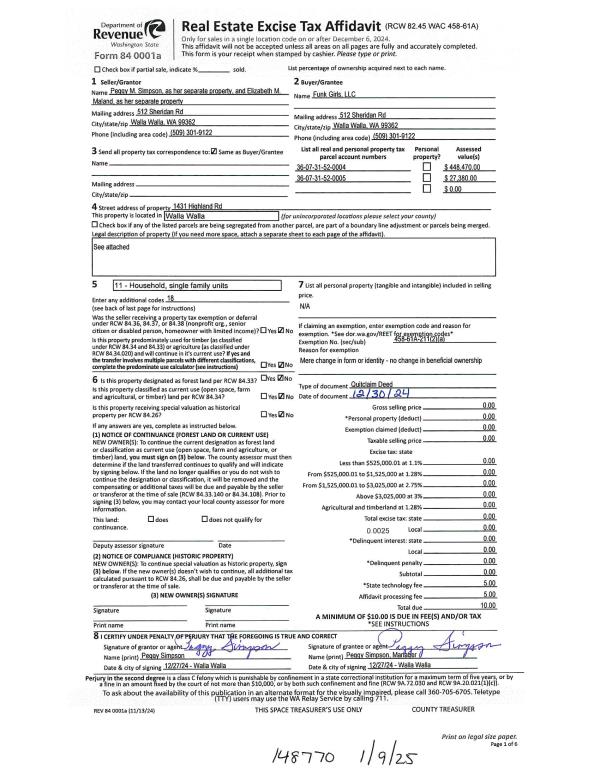 | 1 | 01/09/2025 | QCD | QUIT CLAIM DEED | MALAND ELIZABETH F & PEGGY M SIMPSON | FUNK GIRLS LLC | | | | 148770 | 2025-00125 |
