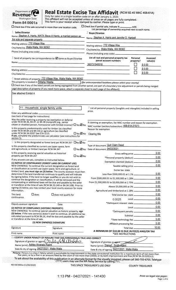 | 1 | 04/22/2021 | QCD | QUIT CLAIM DEED | HARRIS STEVE A | HARRIS STEPHEN A & JENNIFER D HARTZELL | | | $0.00 | 141430 | 2021-04933 |