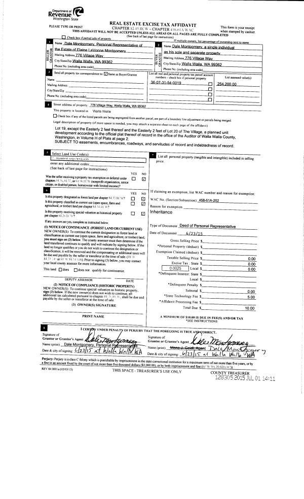 | 2 | 06/23/2015 | DPR | DEED OF PERSONAL REPRESENTATIVE | MONTGOMERY DALE & ELAINE | MONTGOMERY DALE | | | $0.00 | 128305 | 2015-05649 |