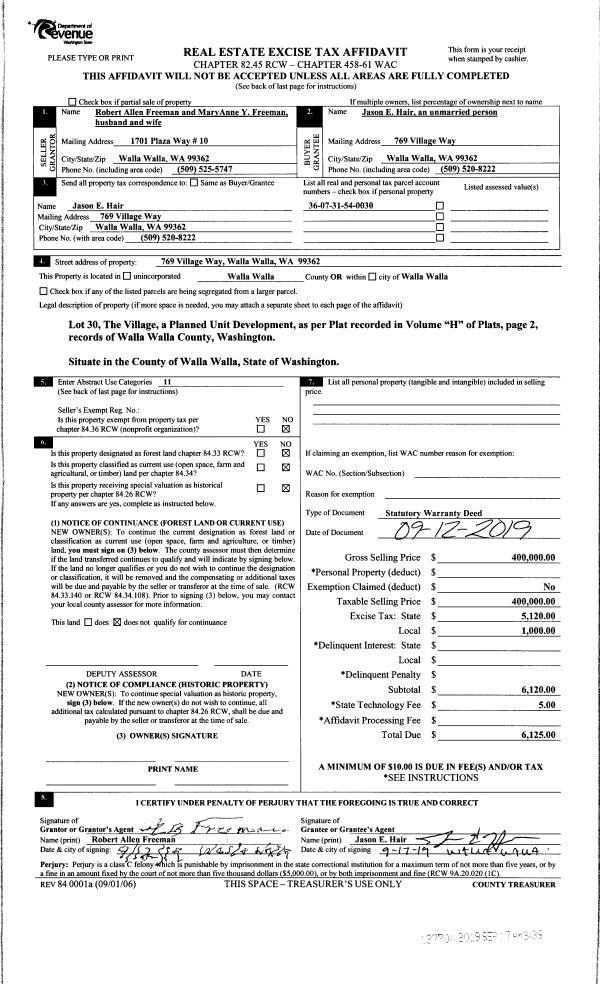 | 1 | 09/17/2019 | SWD | STATUTORY WARRANTY DEED | FREEMAN ROBERT A | HAIR JASON E | | | $400,000.00 | 137704 | 2019-07279 |