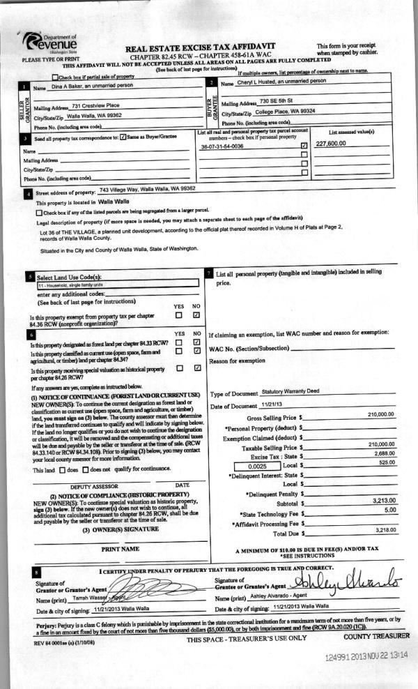| 4 | 11/22/2013 | WARRANTY D | WARRANTY DEED | BAKER DINA A | HUSTED CHERYL L | | | $210,000.00 | 124991 | 2013-11441 |