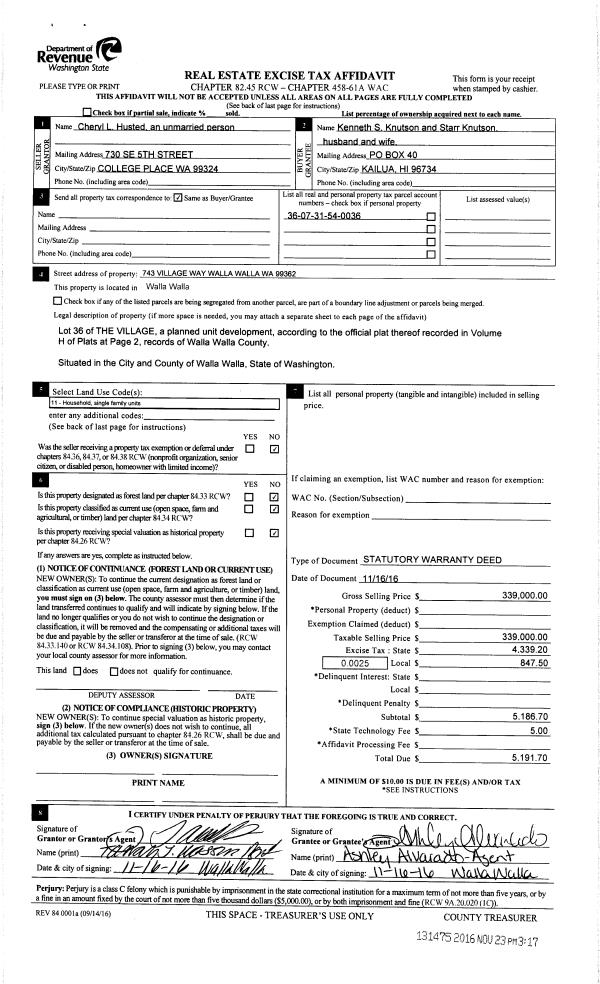 | 3 | 11/23/2016 | SWD | STATUTORY WARRANTY DEED | HUSTED CHERYL L | KNUTSON KENNETH S & STARR | | | $339,000.00 | 131475 | 2016-09649 |