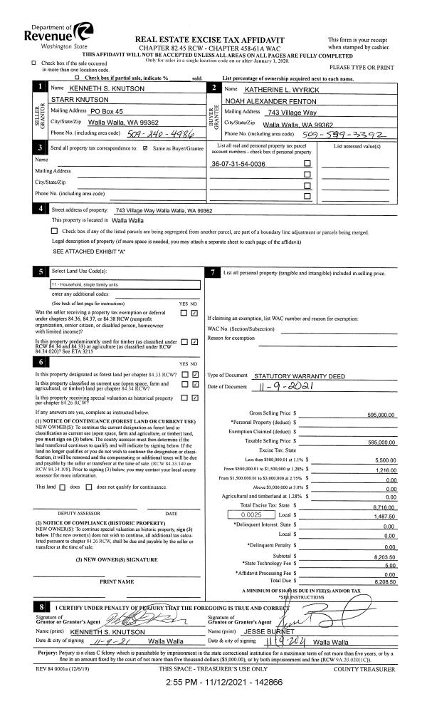 | 2 | 11/12/2021 | SWD | STATUTORY WARRANTY DEED | KNUTSON KENNETH S & STARR | WYRICK KATHERINE L | | | $595,000.00 | 142866 | 2021-13557 |