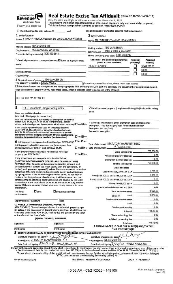 | 1 | 03/21/2025 | SWD | STATUTORY WARRANTY DEED | BLACKWELDER J TIMOTHY & LOIS G | MURPHY MILES & MELISSA | | | $750,000.00 | 149105 | 2025-01490 |