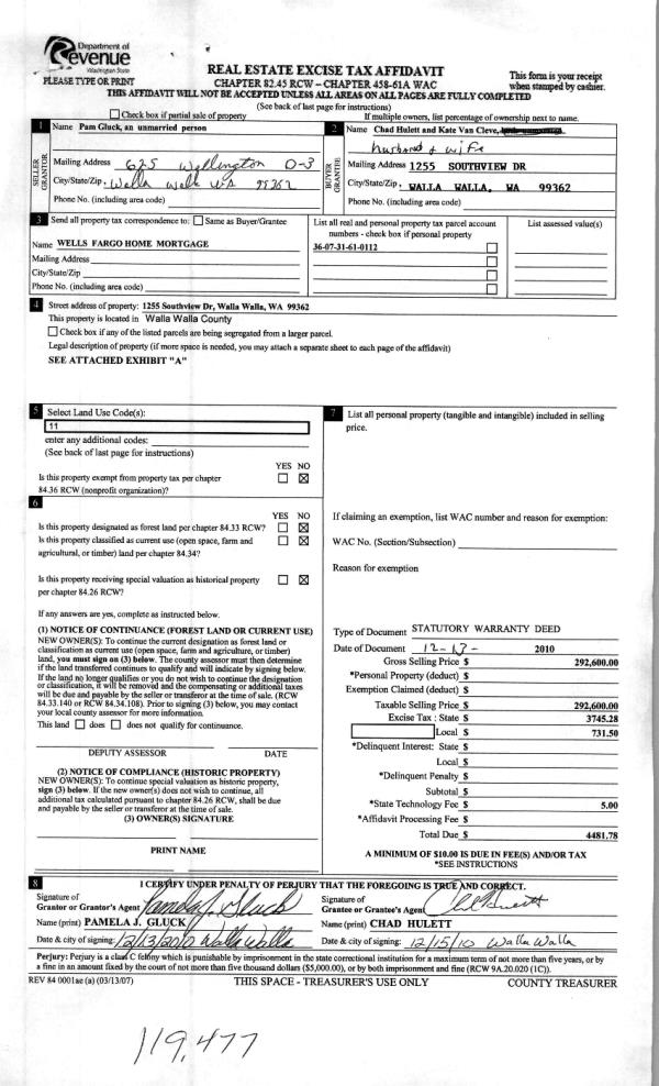 | 1 | 12/17/2010 | WARRANTY D | WARRANTY DEED | GLUCK, PAMELA J | HULETT, CHAD | | | $292,600.00 | 119477 | 2010-10456 |