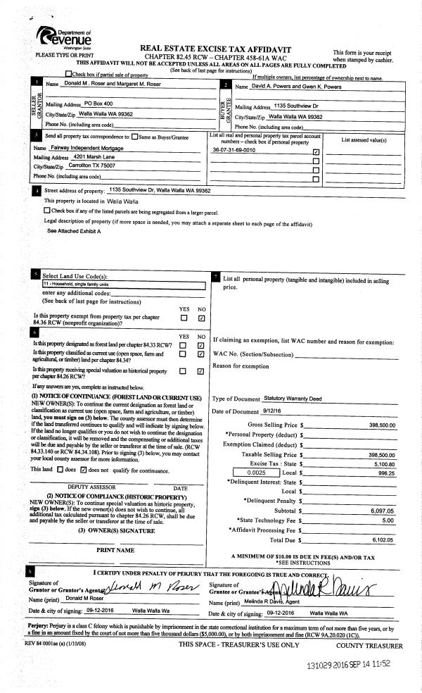 | 1 | 09/14/2016 | SWD | STATUTORY WARRANTY DEED | ROSER DONALD M & MARGARET M | POWERS DAVID A & GWEN K | | | $398,500.00 | 131029 | 2016-07491 |