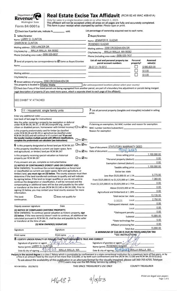 | 3 | 09/15/2023 | SWD | STATUTORY WARRANTY DEED | CLINTON LARRY D & SHARON M | GUIZAR JENNIFER R & ROSENDO | | | $1,100,000.00 | 146487 | 2023-05414 |